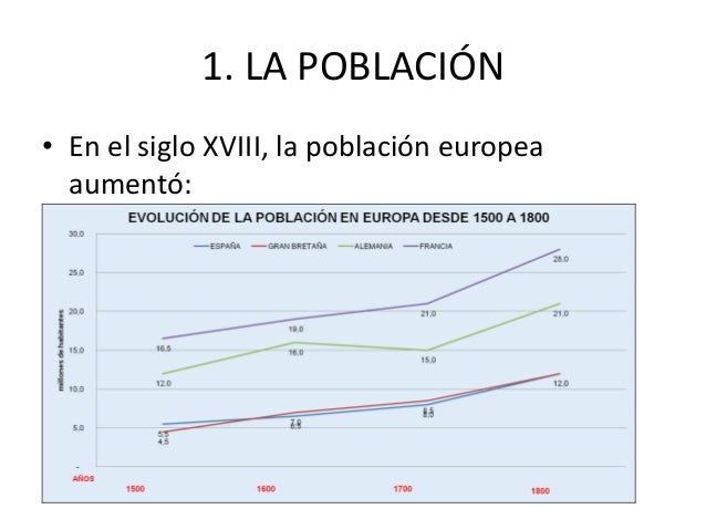 La población europea experimentó un crecimiento sobre todo en la segunda mitad del siglo XVII, pasando de 110 millones en 1700 a 187 en 1800. Este crecimiento estuvo basado en el descenso de la mortalidad en especial de la mortalidad infantil como consecuencia de la desaparición de la peste bubónica. Por otro lado, la natalidad se mantuvo elevada. La agricultura aún era la fuente principal de la riqueza en el siglo XVIII y ocupaba a la mayor parte de la población (entre el 80% en Francia y el 90% en Rusia).