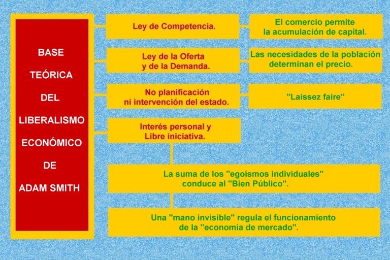 - Sin embargo, el verdadero creador de la doctrina del liberalismo económico fue Adam Smith. La verdadera riqueza de un país es el trabajo de sus habitantes. Por ello, para que la economía funcione con eficacia el hombre ha de ser libre para actuar por el impulso de su interés personal y estar sometido sólo a las leyes del mercado (ley de la oferta y de la demanda). Para lograr esta libertad económica, los gobiernos garantizarían una total libertad tanto en la producción nacional como en el comercio internacional (librecambio). El liberalismo limita la intervención del Estado en la actividad económica.