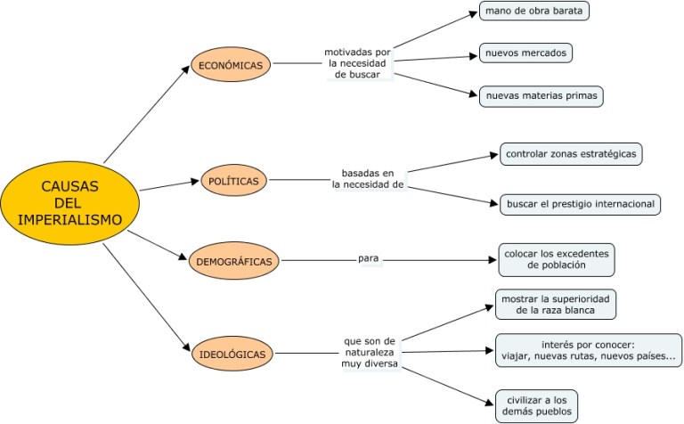 - La exploración y conquista de zonas donde conseguir materias primas y energéticas abundantes y baratas. A las colonias se les asignó el papel de abastecer a las industrias metropolitanas.