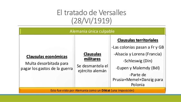 El tratado de Versalles (28 de junio de 1919) Es el tratado más importante de todos los que se firmaron. A Alemania se le considera la única responsable de la guerra y por tanto se le impondrán fuertes sanciones. A la hora de tratar a Alemania había dos posturas, la francesa que era de intransigencia y dureza y la de Gran Bretaña y Estados Unidos que era más flexible. Desde el punto de vista territorial Alemania cedió Alsacia y Lorena a Francia; a Bélgica, ciudades fronterizas; a Dinamarca, la mitad norte de Schleswig; y al recién nacido Estado polaco se le entregaba Posnania. Fuera de Europa perderá sus colonias que pasarán a Gran Bretaña y Francia.
